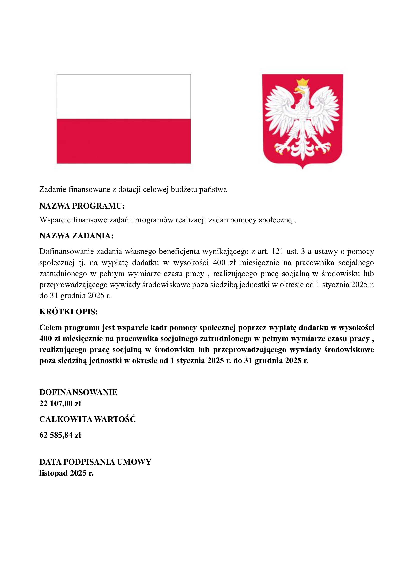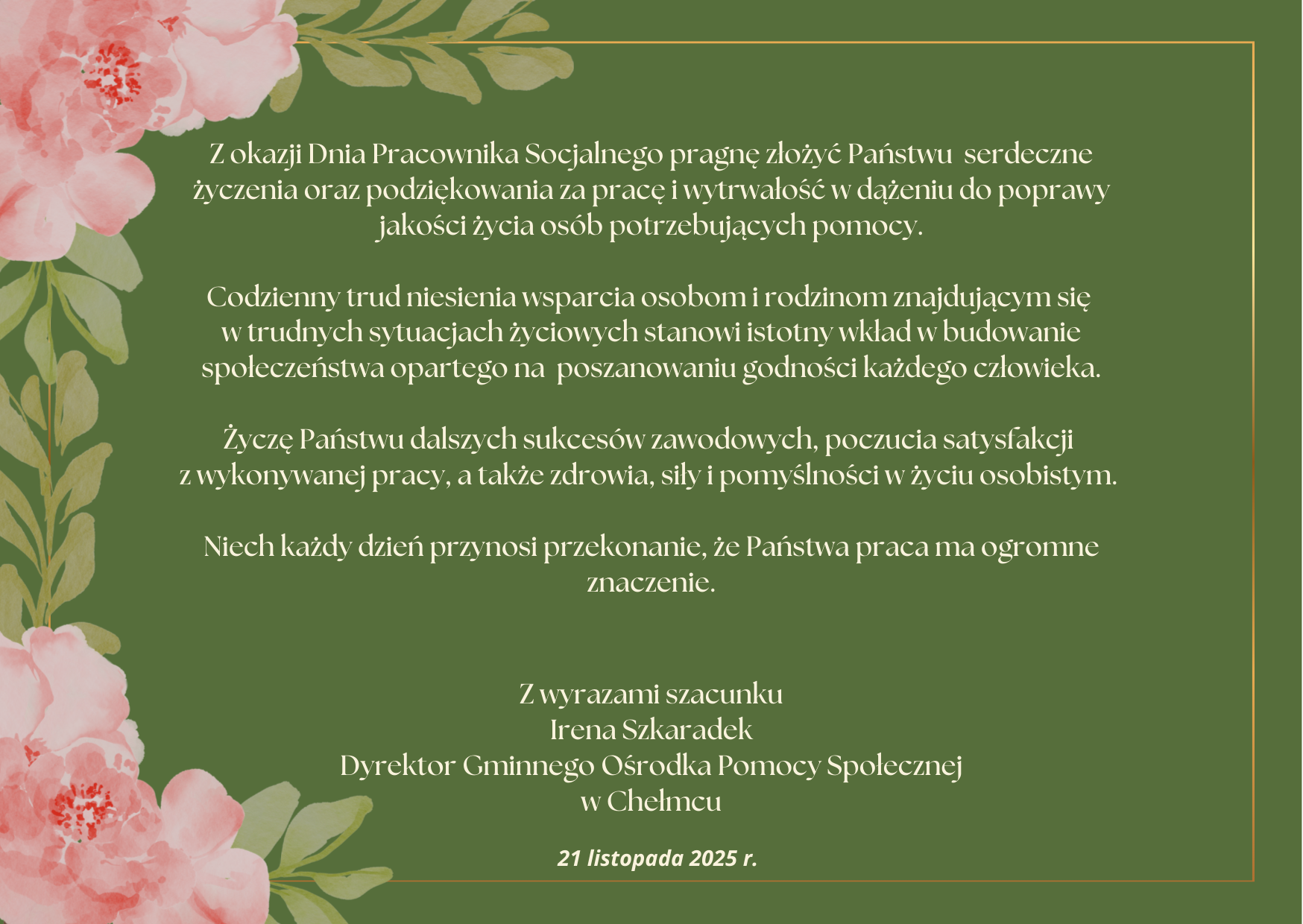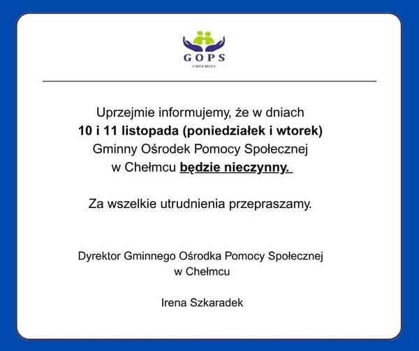 Informacja w sprawie organizacji pracy Gminnego Ośrodka Pomocy Społecznej w Chełmcu w dniach 10 i 11 listopada 2025 r.