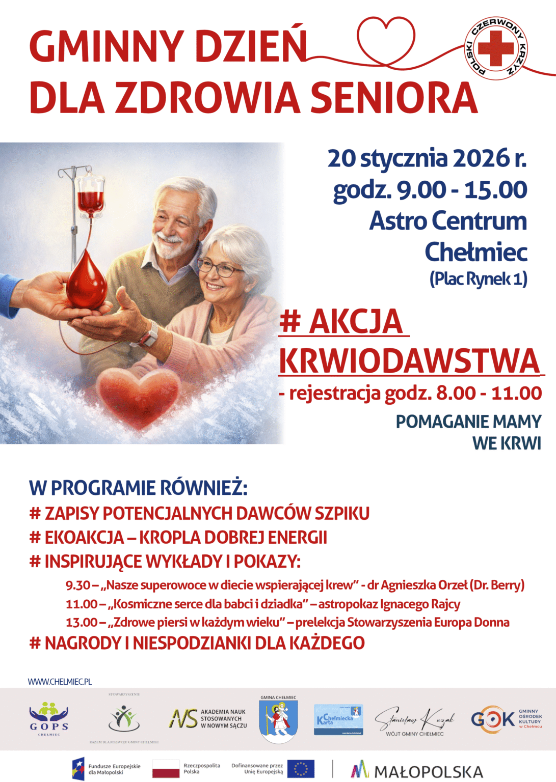 – Z okazji Dnia Babci i Dziadka chcemy w wyjątkowy sposób powiedzieć naszym seniorom „dziękujemy” – mówi Stanisław Kuzak, wójt Chełmca, zapraszając na międzypokoleniowe wydarzenie, które odbędzie się 20 stycznia w Astro Centrum Chełmiec w godzinach od 9 do 15. Sercem Gminnego Dnia dla Zdrowia Seniora będzie akcja krwiodawstwa. Rejestracja osób, które chcą podzielić się najcenniejszym darem, jaki w nas płynie, rozpocznie się o godz. 8.
