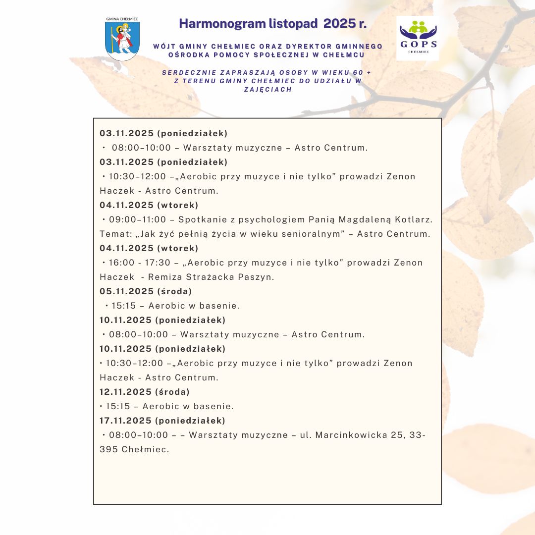 Dostępny jest już harmonogram działań senioralnych na listopad 2025 r. Przypominamy, że z oferty mogą korzystać wyłącznie osoby mieszkające na terenie gminy Chełmiec oraz spełniające kryterium wieku senioralnego.
