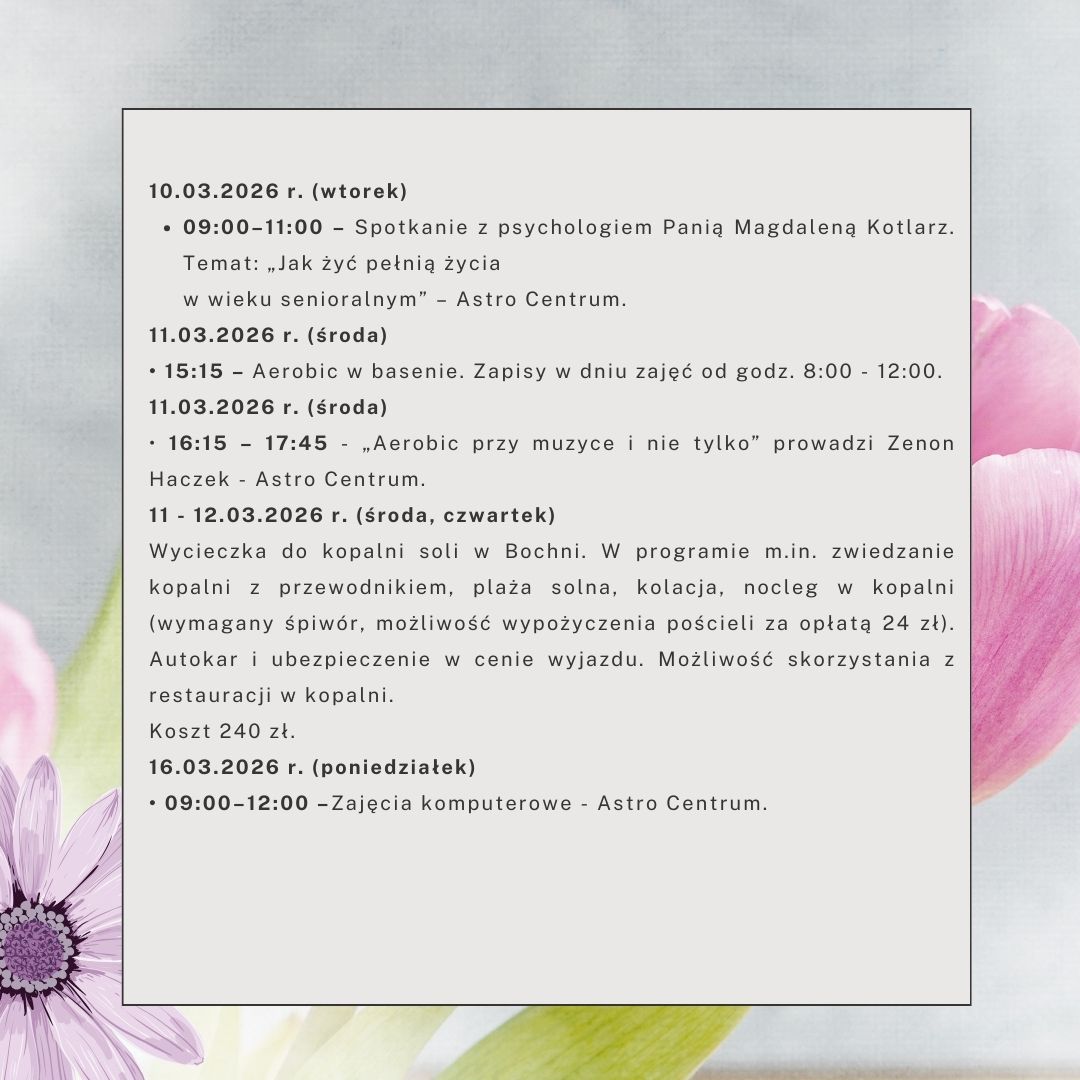 W marcu zaplanowaliśmy wiele ciekawych aktywności m.in.: wyjazd z noclegiem do kopalni soli w Bochni oraz na baseny termalne w Bukowinie Tatrzańskiej, a także gimnastyka na basenie, spotkania muzyczne, z psychologiem oraz wiele innych.