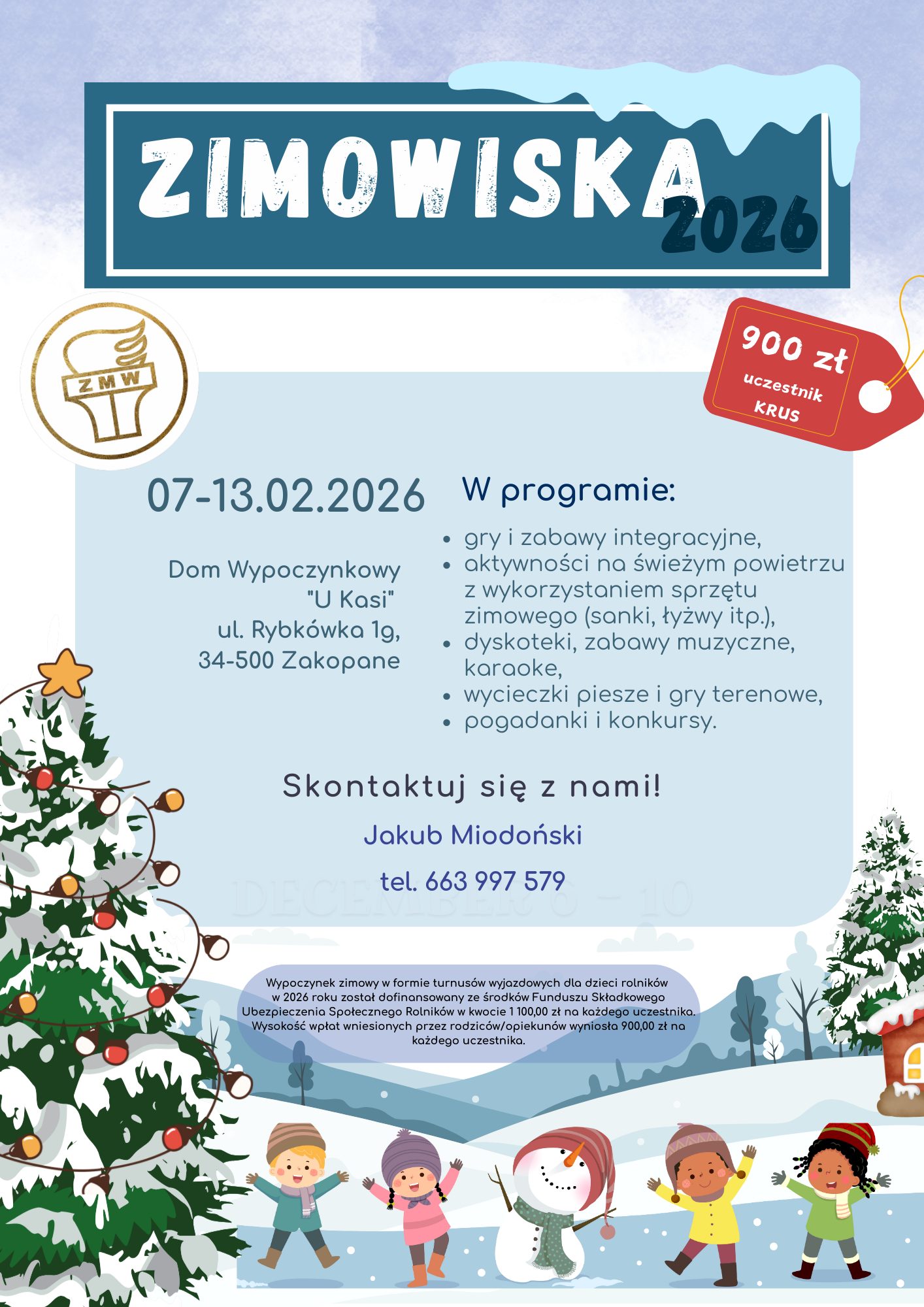 Związek Młodzieży Wiejskiej zaprasza dzieci i młodzież z terenu województwa małopolskiego do udziału w zimowym wypoczynku w formie turnusu wyjazdowego w 2026 roku.