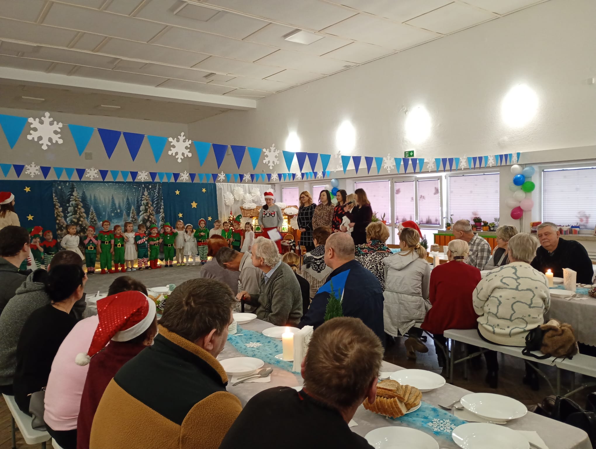 Dzieci z grupy przedszkolnej „Smerfy” zaprezentowały spektakl „Zimowe przedstawienie”, wprowadzając wszystkich w wyjątkowy, świąteczny klimat. W prezentację artystyczną włożyły wiele energii i zaangażowania. Po występie uczestnicy zasiedli do wspólnego poczęstunku oraz otrzymali prezenty przygotowane przez zespół projektowy. Spotkanie stanowiło przestrzeń do integracji i budowania relacji międzypokoleniowych, podkreślając znaczenie empatii oraz wrażliwości wobec potrzeb drugiego człowieka.
