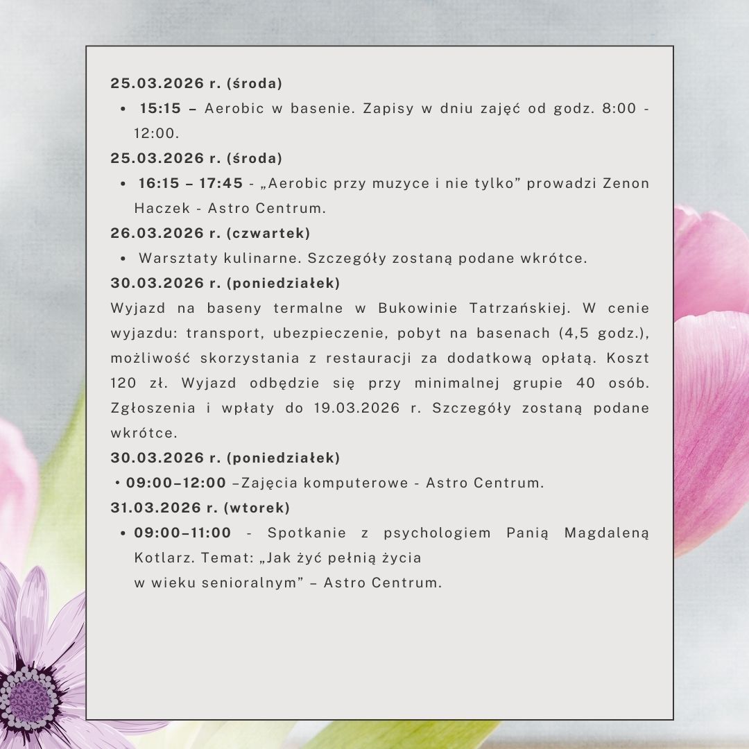 W marcu zaplanowaliśmy wiele ciekawych aktywności m.in.: wyjazd z noclegiem do kopalni soli w Bochni oraz na baseny termalne w Bukowinie Tatrzańskiej, a także gimnastyka na basenie, spotkania muzyczne, z psychologiem oraz wiele innych.