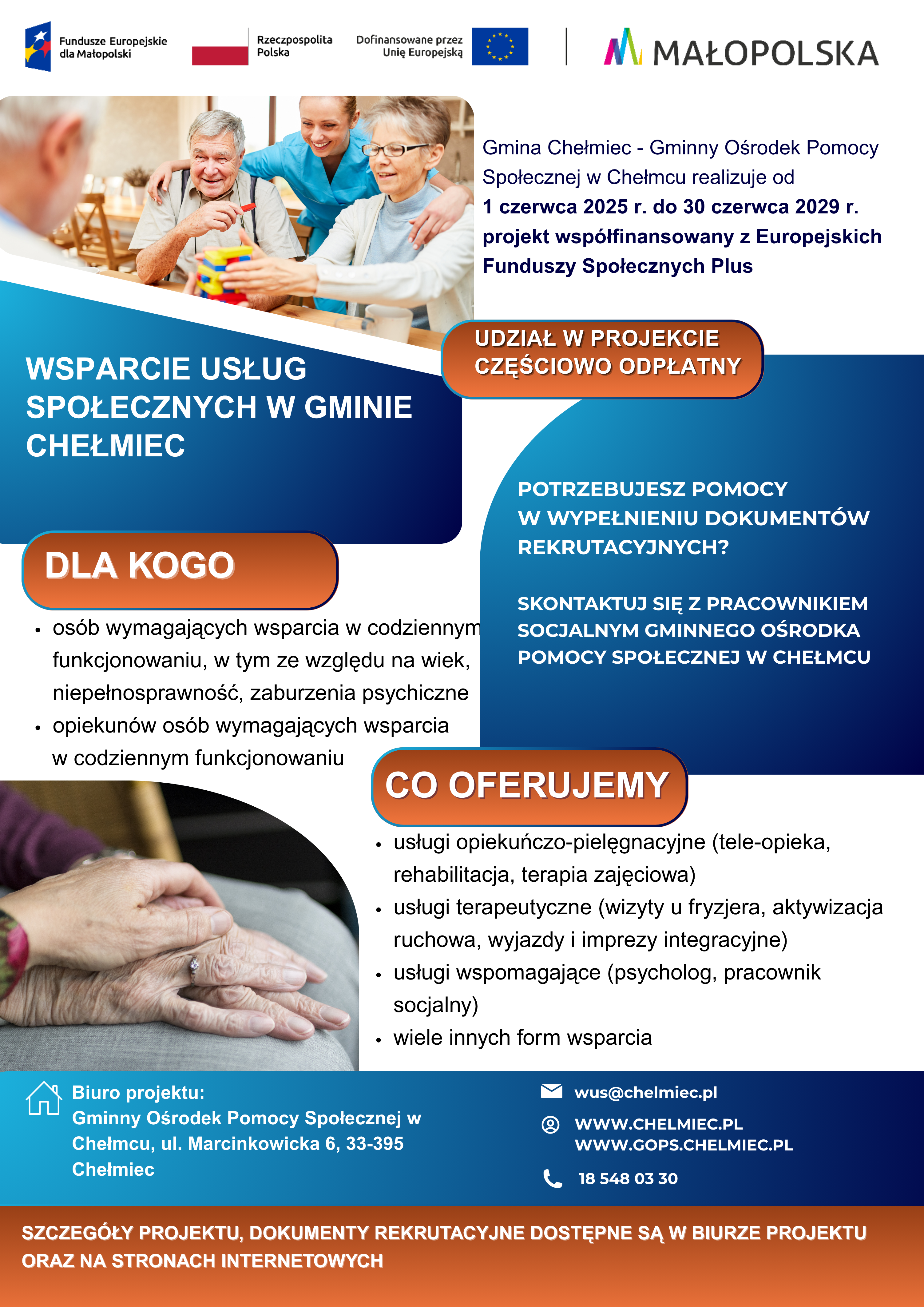 Informujemy, że rozpoczyna się kolejną rekrutację do projektu nr FEMP.06.33-IP.01-1525/24 pn. „Wsparcie usług społecznych w Gminie Chełmiec” realizowanego w ramach Działania 6.33 Programu Fundusze Europejskie dla Małopolski na lata 2021-2027, współfinansowanego przez Unię Europejską w ramach Europejskiego Funduszu Społecznego Plus.